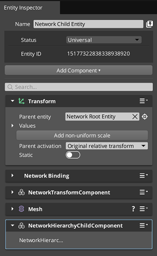 In order to declare a network hierarchy, you have to use a combination of hierarchical components: NetworkHierarchyRootComponent and NetworkHierarchyChildComponent. NetworkHierarchyRootComponent marks an entity as the root of a hierarchy and it should be placed on the highest parent of your entity prefab or a group of entities. NetworkHierarchyRootComponent marks an entity as a child of a hierarchy. It should be added on child entities under the entity with NetworkHierarchyRootComponent.